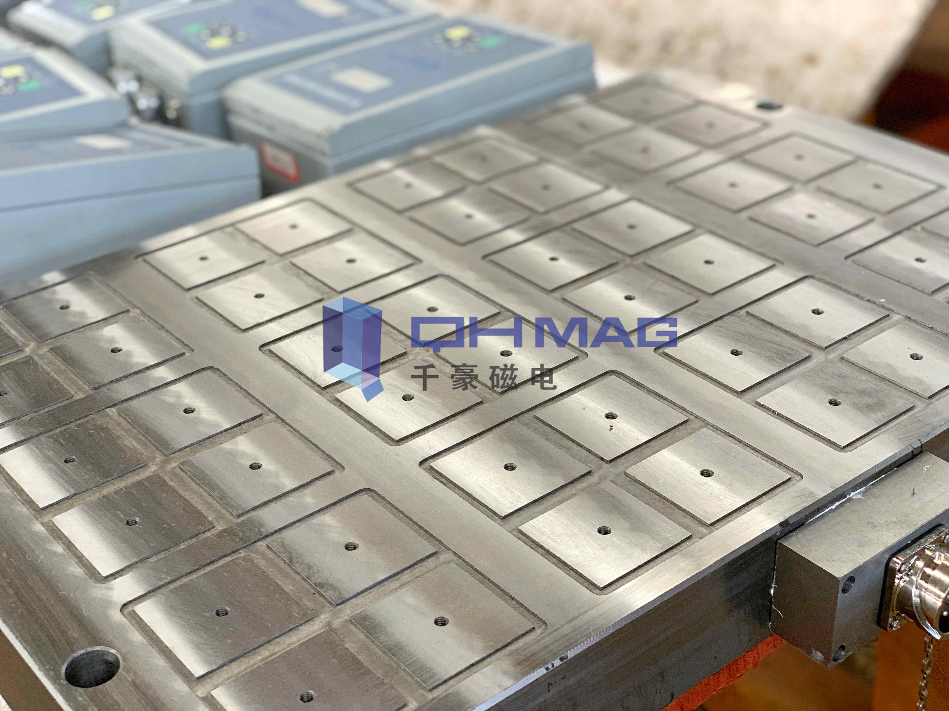 電永磁吸盤使用于CNC加工中心,常作輔助定位調整工具——定位夾具用。用于在加工中心對單件、小批量、工作量較大的模具進行調整,實現磁性定位,避免模具夾持時對其所造成的損傷。對單件、小批量、工作量較大的模具加工,一般可直接在機床工作臺面上通過應用電永磁吸盤進行調整,從而實現定位與夾緊,然后通過加工坐標系的設定來確定零件的位置。簡單來說就是用于夾持定位工件,讓工件便于加工,這就是加工中心電永磁吸盤的用處。千豪磁電設計的電永磁吸盤是擁有自動輔助定位功能的新型電控永磁吸盤,電永磁吸盤3s即可完成工件的裝夾定位,一面裝夾五面加工,真正實現高效率加工作業。