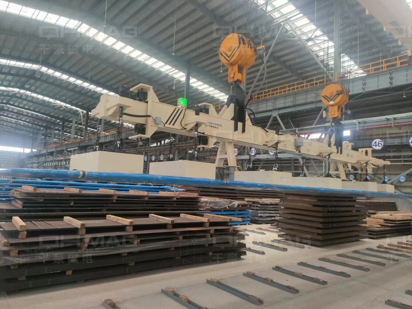 本次案例來源于:湖南千豪磁電為廣西某有限公司設(shè)計的【伸縮梁電永磁吊具】,由于該公司鋼板堆放空間有限鋼板長度尺寸差距較大,原有設(shè)備跺板機(jī)在吊運中經(jīng)常劃傷包裝,設(shè)備因汽車尺寸限制而產(chǎn)生干涉,嚴(yán)重影響鋼板出庫的質(zhì)量和效率,因此千豪磁電依據(jù)該公司鋼板尺寸設(shè)計了這款伸縮橫梁電永磁吊具。