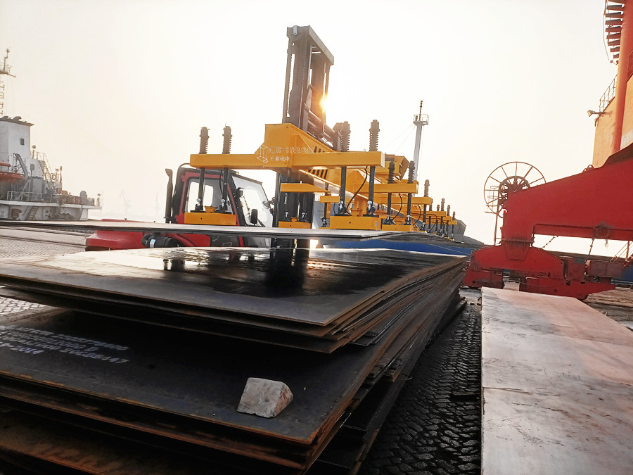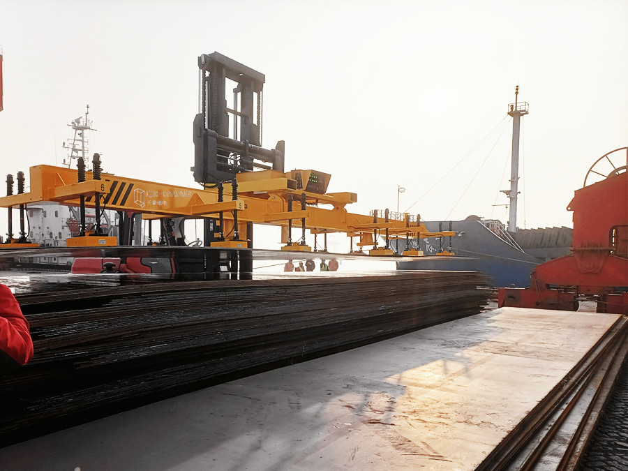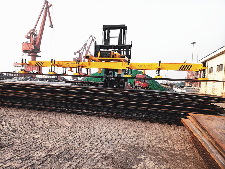 此款磁力吊具用在港口配合叉車使用吊運長鋼板。本套充電式鋼板起重吊具采用12組電永磁起重器聯吊。可實現單張鋼板max重量為4噸、厚度8mm、10mm、12mm鋼板一次搬運二張平穩運行。厚度14mm、16mm鋼板一次搬運一張平穩運行。